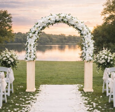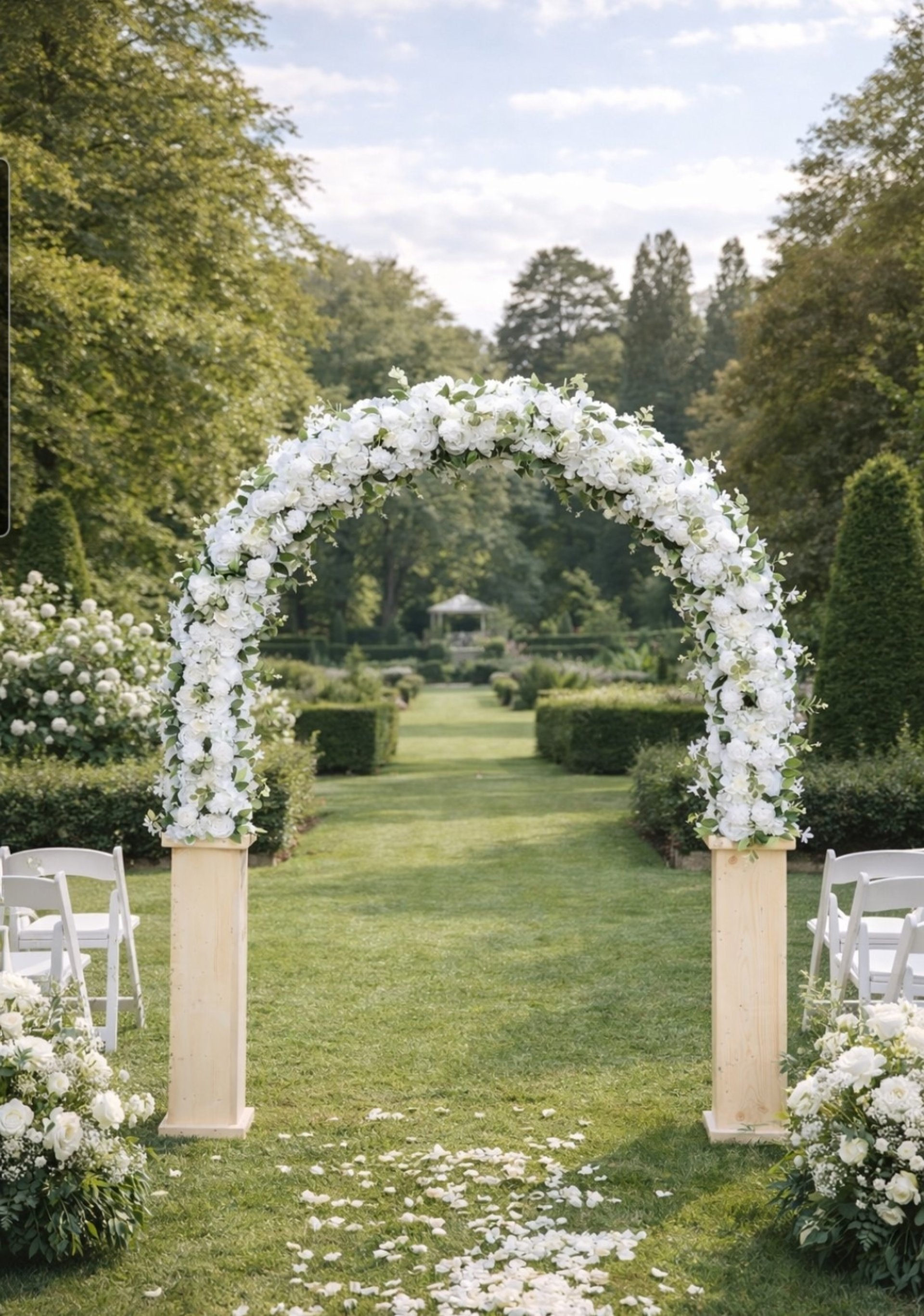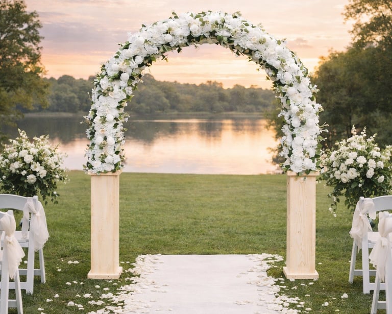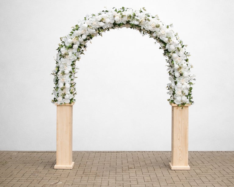 Onze elegante trouwboog is een echte eyecatcher tijdens jullie ceremonie. De trouwboog is stijlvol afgewerkt en rijk gedecoreerd met witte bloemen en groen, wat zorgt voor een romantische en tijdloze uitstraling. Met een inwendige maat van 2.20m hoog en 1.50m breed biedt hij voldoende ruimte voor het bruidspaar en biedt hij voldoende ruimte voor het bruidspaar en vormt hij het perfecte decor voor het ja-woord en onvergetelijke foto's